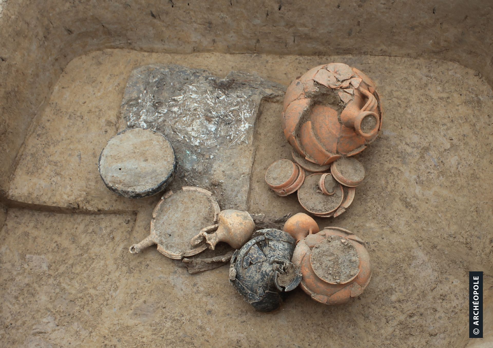 Tombe à ossuaire contenant de la vaisselle en terre cuite et un miroir en alliage cuivreux, datée du Ier s. de notre ère. © Photographie Archéopole