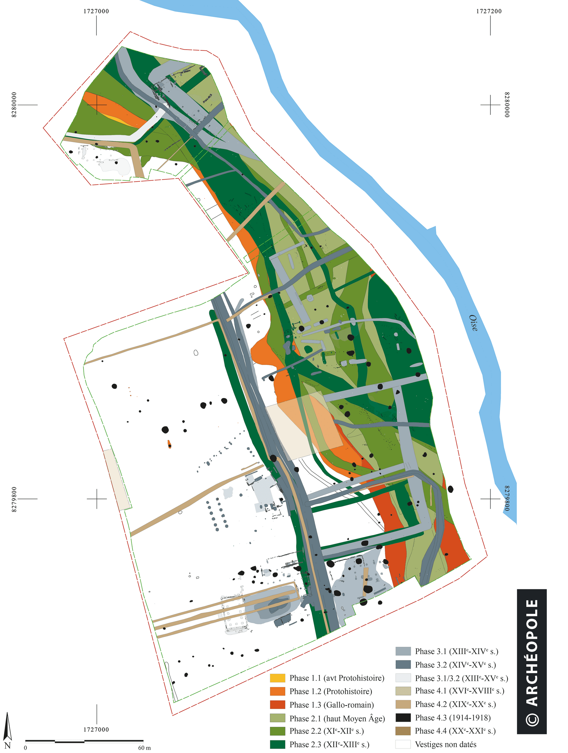 Au cours des XIIIe-XVe s., la mise en place de plusieurs habitats médiévaux avec un déplacement du cours de l’Oise vers l’est pour lequel des petites ramifications actives pourraient encore structurer le site est identifiée. Certains bâtiments prennent d’ailleurs place sur le paléochenal comblé à cette période. Cette évolution est corroborée par les différentes analyses (stratigraphie relative, géomorphologie, céramique, datations radiocarbones). Une reconnaissance des différents habitats a été opérée permettant de caractériser une dizaine de bâtiments. L’apparition de cinq établissements agricoles composés de plusieurs bâtiments et regroupés en deux parties distinctes ou hameaux marque le site à cette période. Ils s’organisent de part et d’autre d’un chemin encavé encadré, au moins dans un premier temps, par des fossés. Il est tentant de rapprocher les hameaux identifiés à des toponymes conservés sur le cadastre de 1825 qui place un premier nom de lieu au sud de la fouille, le « Clos des Isles », et un second au nord de la zone, le « Pressy ». Les hameaux comprennent chacun un ou plusieurs établissements agricoles organisés autour de cours en terre battue et/ou en craie damée et comportant plusieurs bâtiments basés sur des solins et/ou plots en calcaire et dont l’attribution fonctionnelle trouve écho dans l’organisation des fermes aux époques modernes et contemporaines en Picardie, à savoir la maison d’habitation, la grange, l’étable…
