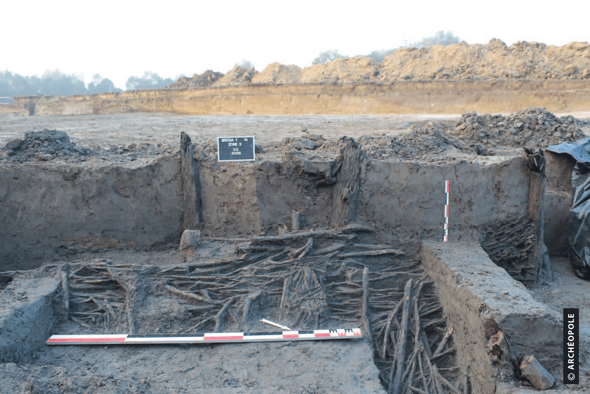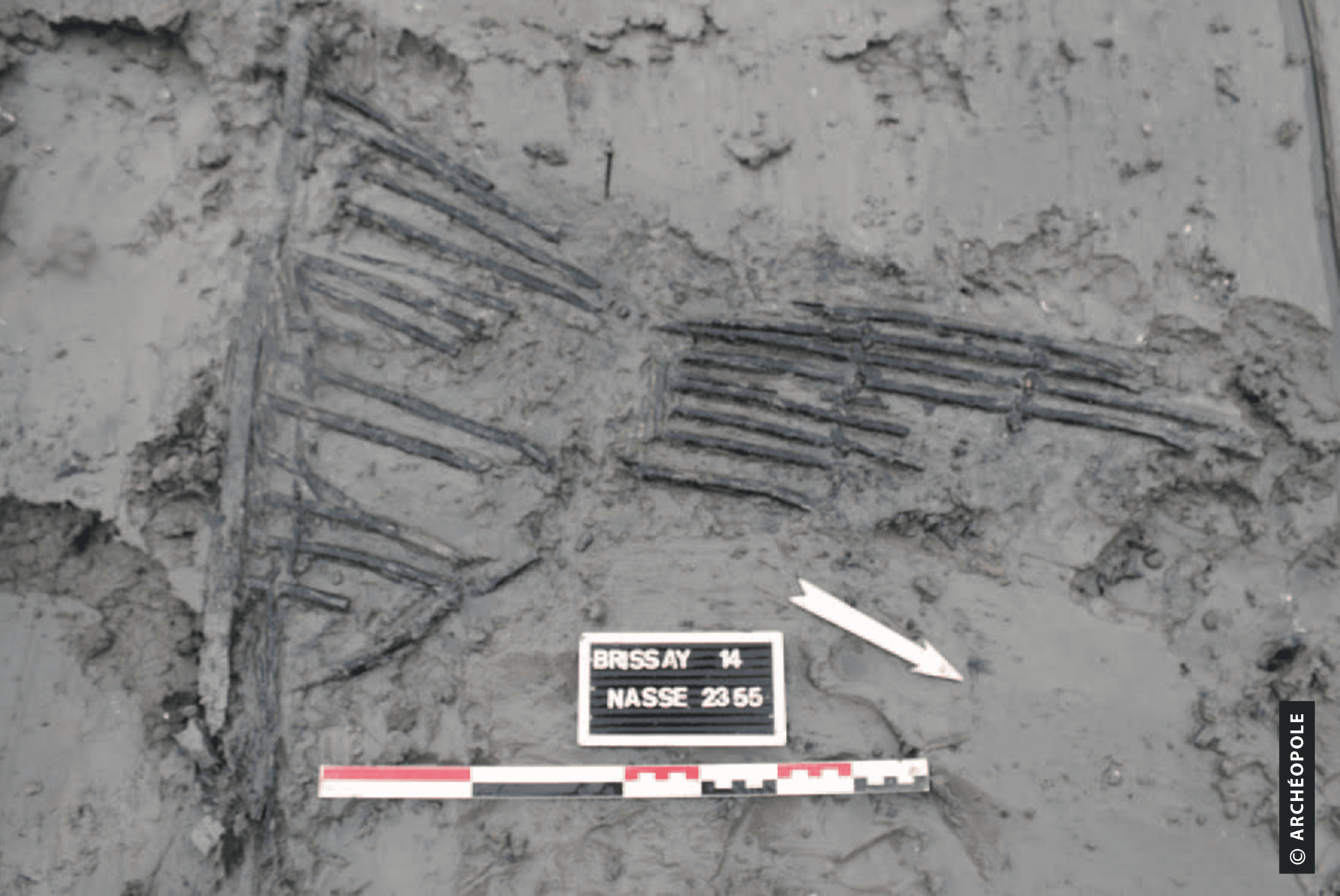 Fouille des vestiges d’une nasse en osier. © Photographie Archéopole 2014-2015