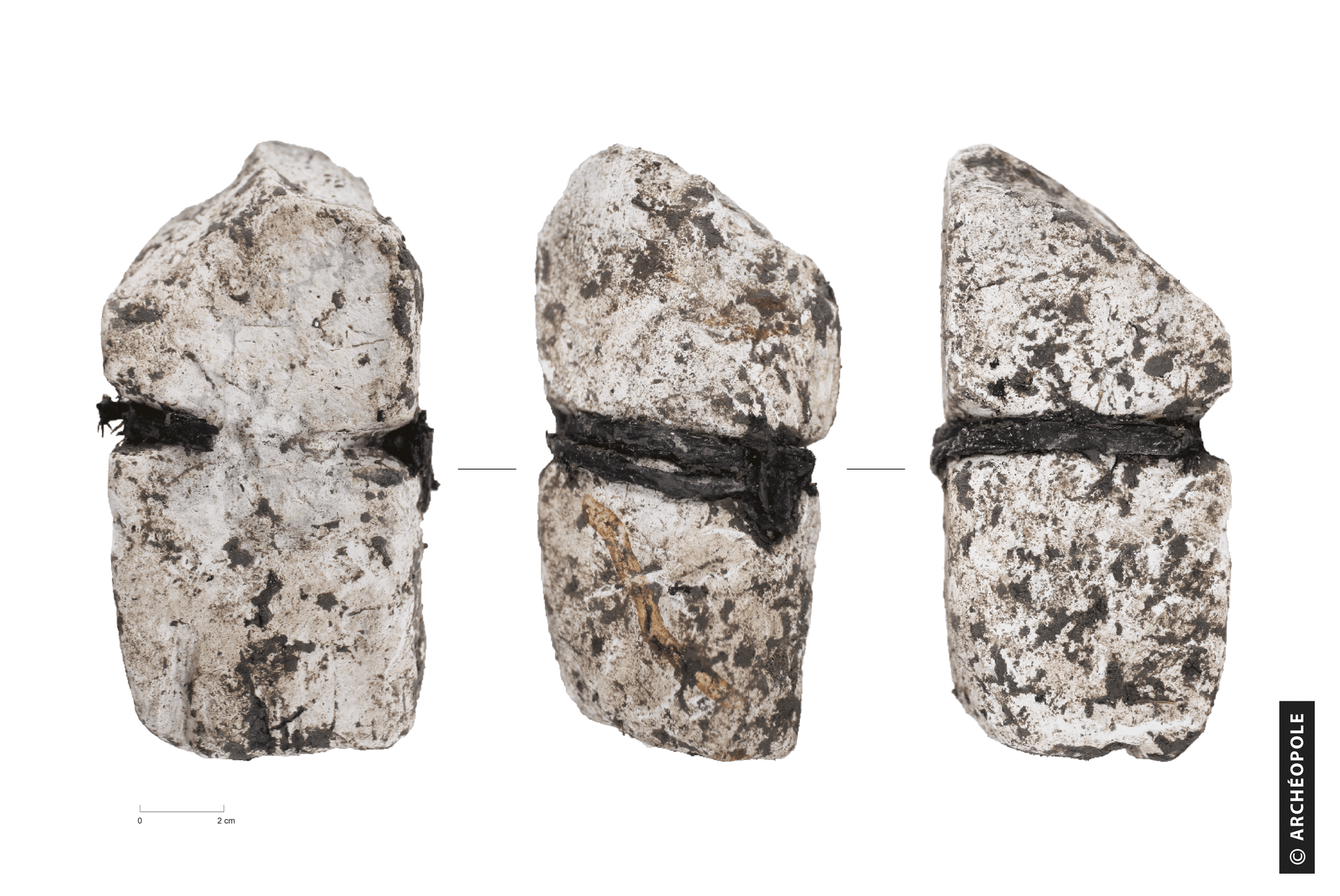 Lest de pêche en calcaire ayant conservé son lien en fibre végétale, daté des IXe-XIIIe s. © Photographies L. Guillemaux Archéopole 2023