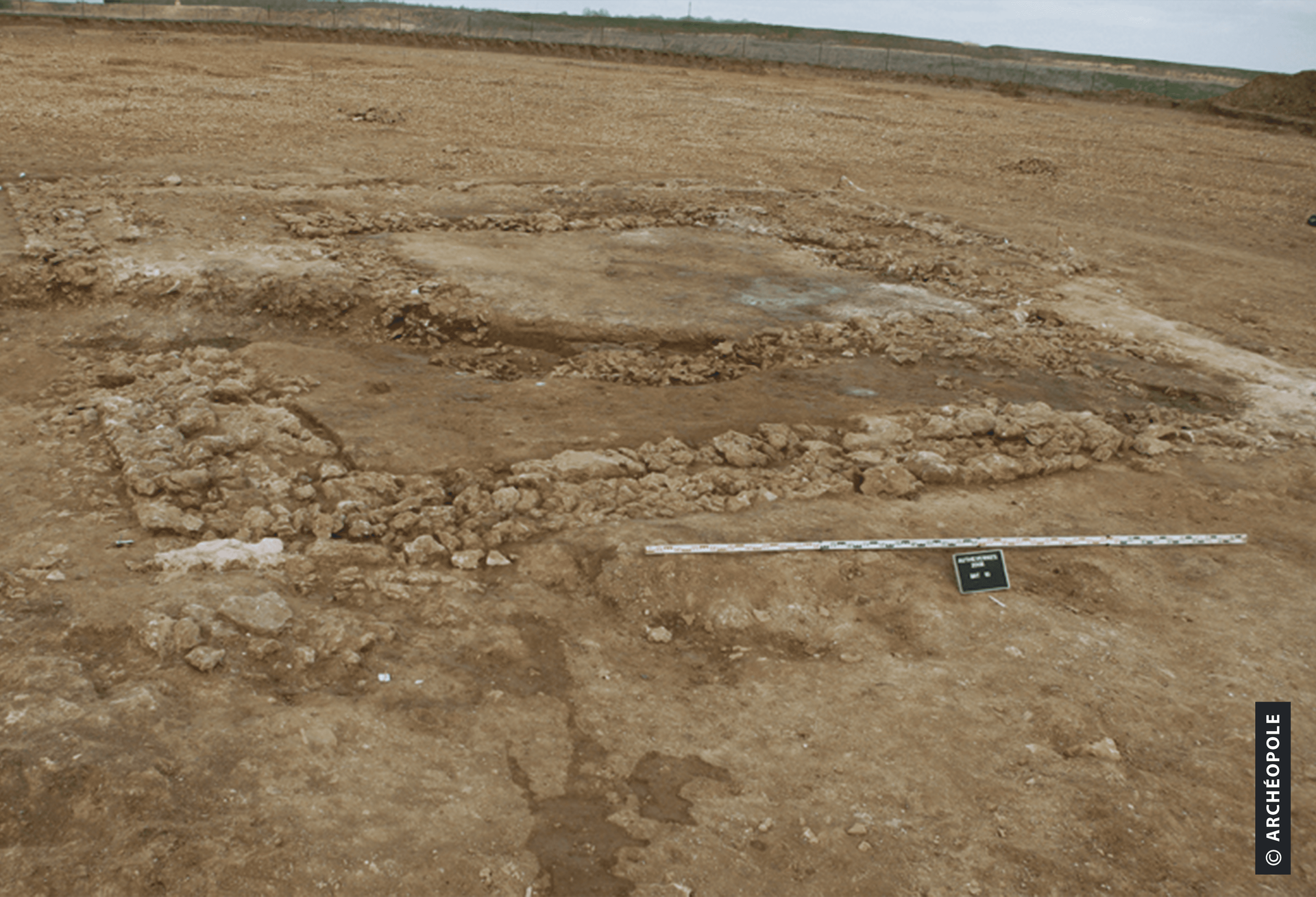 Vestiges du fanum antique, constitués de fondations en blocs calcaires.© Photographie Archéopole 2009