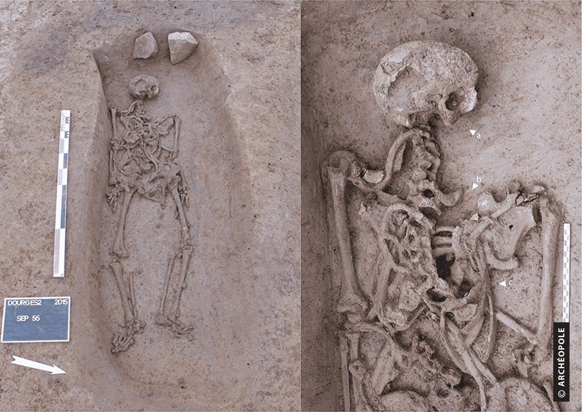 Sépulture mérovingienne présentant des indices de pillage ancien, relevés au niveau du squelette : retournement de la mandibule (a) et bouleversement de la cage thoracique et des vertèbres (b et c). © Photographies Archéopole 2018
