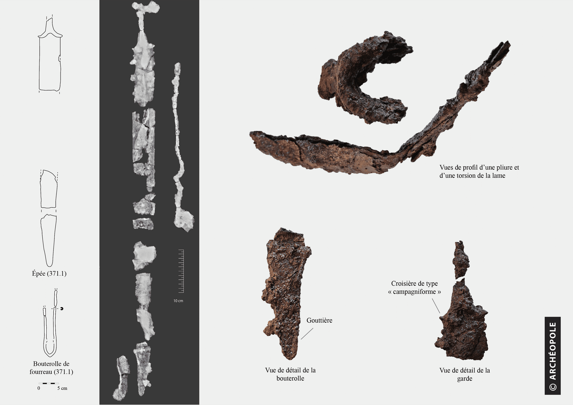 Caractéristiques de l’épée celtique volontairement mutilée de Dourges. © Dessin : J.-P. Duchemin, Archéopole, 2016 ; radiographie : Imanord, 2019 ; photographies : Archéopole 2019.