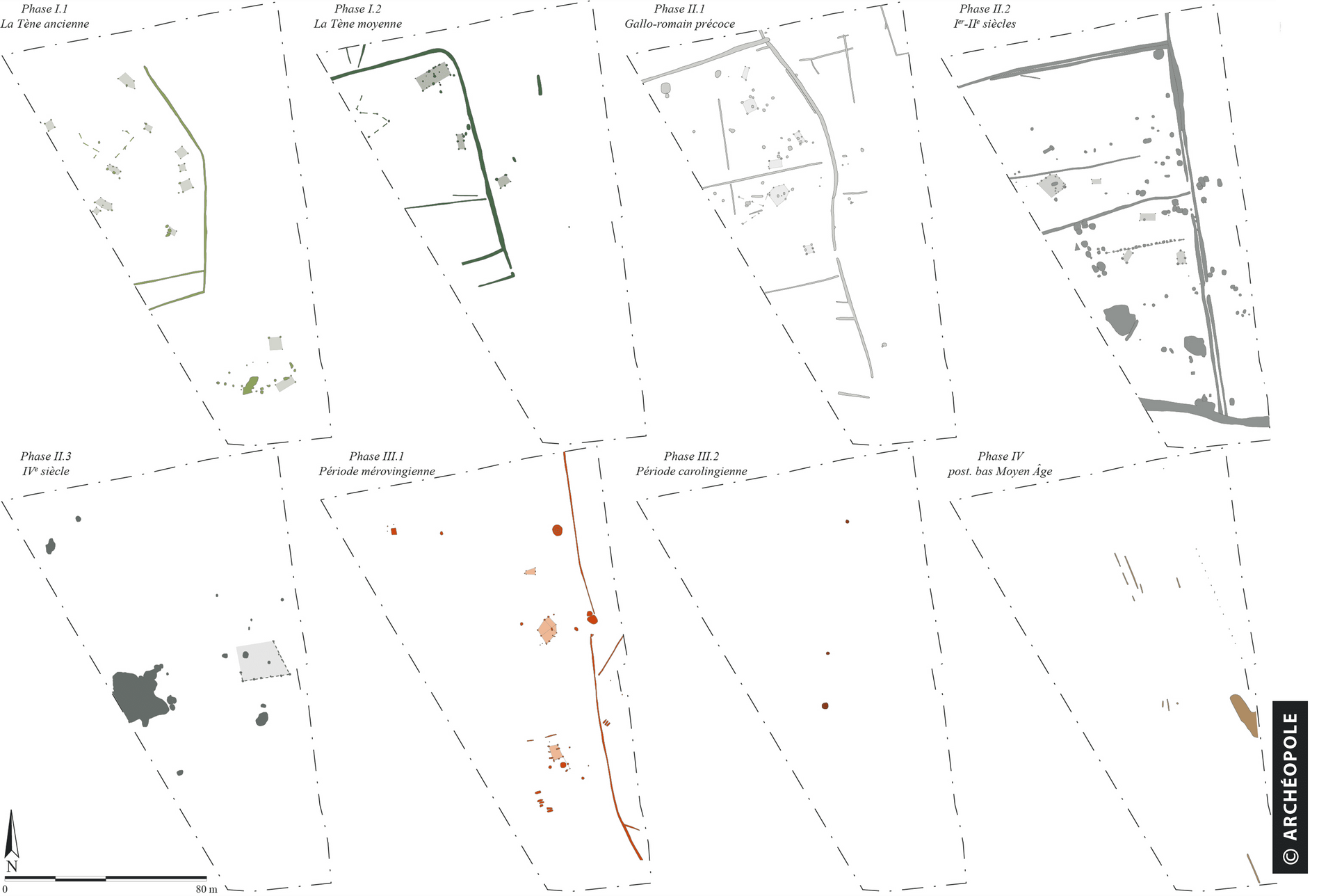 Dès La Tène ancienne, les débuts de l'occupation se matérialisent par la mise en place d'un réseau fossoyé structurant les différents espaces au sein desquels se développent des zones d'habitat et d'activités. Deux types d'installation se distinguent géographiquement et morphologiquement. Localisée dans la moitié nord-ouest de l’emprise, la première comprend de nombreux bâtiments sur poteaux et est intégrée à un enclos fossoyé tandis que la seconde rassemble plutôt des fosses, une crémation et une cuvette colmatée et s'étend en aire ouverte au sud du site. Dix unités construites ont été déterminées au sein de l’enclos en fonction de l'agencement des différents poteaux, du mobilier et des datations radiocarbones recueillis et de l'organisation générale de l'occupation. La plupart des bâtiments reposent sur 4 poteaux et se rattachent d'un point de vue typologique aux exemplaires fréquemment rencontrés de greniers surélevés à 4 poteaux porteurs. La surface au sol pouvant être un élément discriminant pour orienter l'interprétation, les structures de moins de 10 m² auraient une vocation de grenier tandis que les unités dépassant 10 m² seraient potentiellement destinées à d'autres utilisations (annexe, grange) ou à l’habitat pour les plus imposantes. Contrairement à l’îlot septentrional, aucune délimitation n'a été observée au sud, l'espace étant considéré comme une installation en aire ouverte. Une organisation particulière semble se dessiner puisque l'ensemble des creusements paraissent être contraints le long d'un tracé formant un arc de cercle.