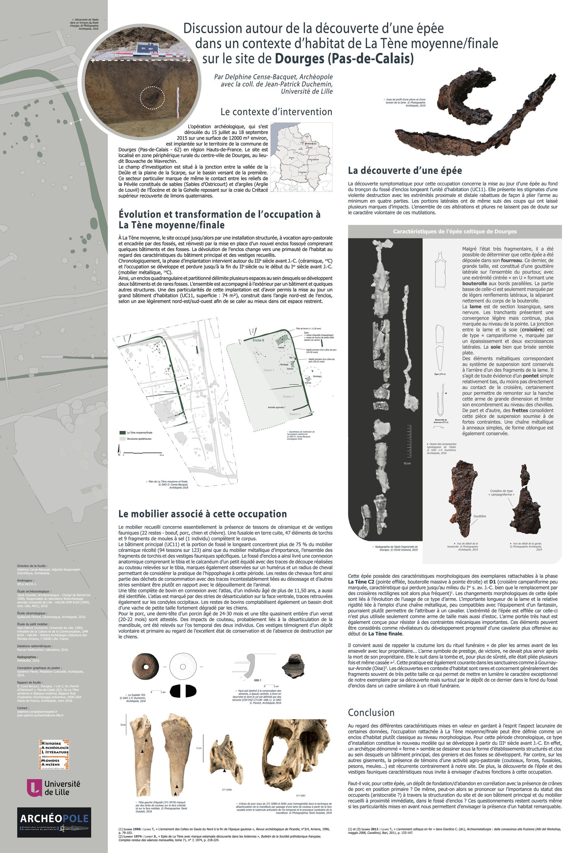 CENSE-BACQUET D., coll. DUCHEMIN J.-P., « Discussion autour de la découverte d’une épée dans un contexte d’habitat de La Tène moyenne sur le site de Dourges (Pas-de-Calais) », poster présenté au colloque Armes et Guerriers, Continuités et changements dans l’équipement du guerrier en Europe et au Proche et Moyen-Orient de l’âge du Bronze au Moyen Âge, Paris, Institut d’Art et d’Archéologie, 29 octobre 2019.