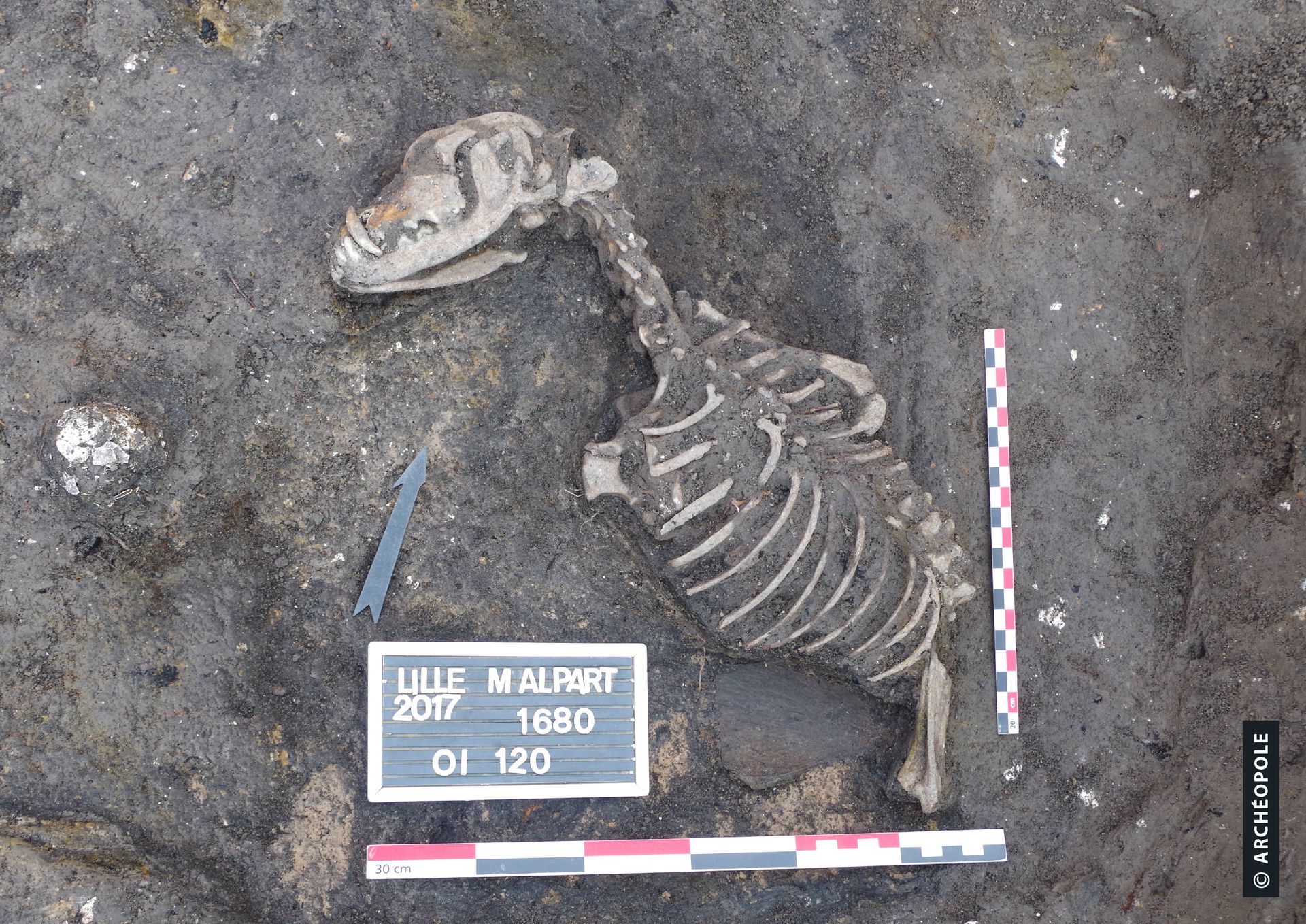 Squelette de chien et œuf découvert dans un cellier (espace de stockage) médiéval. © Photographie D. Cense-Bacquet Archéopole 2017
