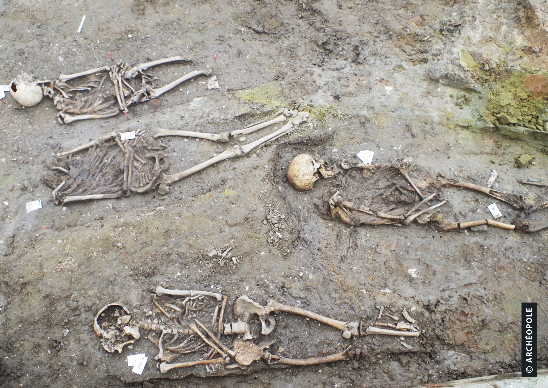Vue des squelettes du cimetière des chartriers (infirmes soignés au sein de l'hospice). © Photographie Archéopole 2017
