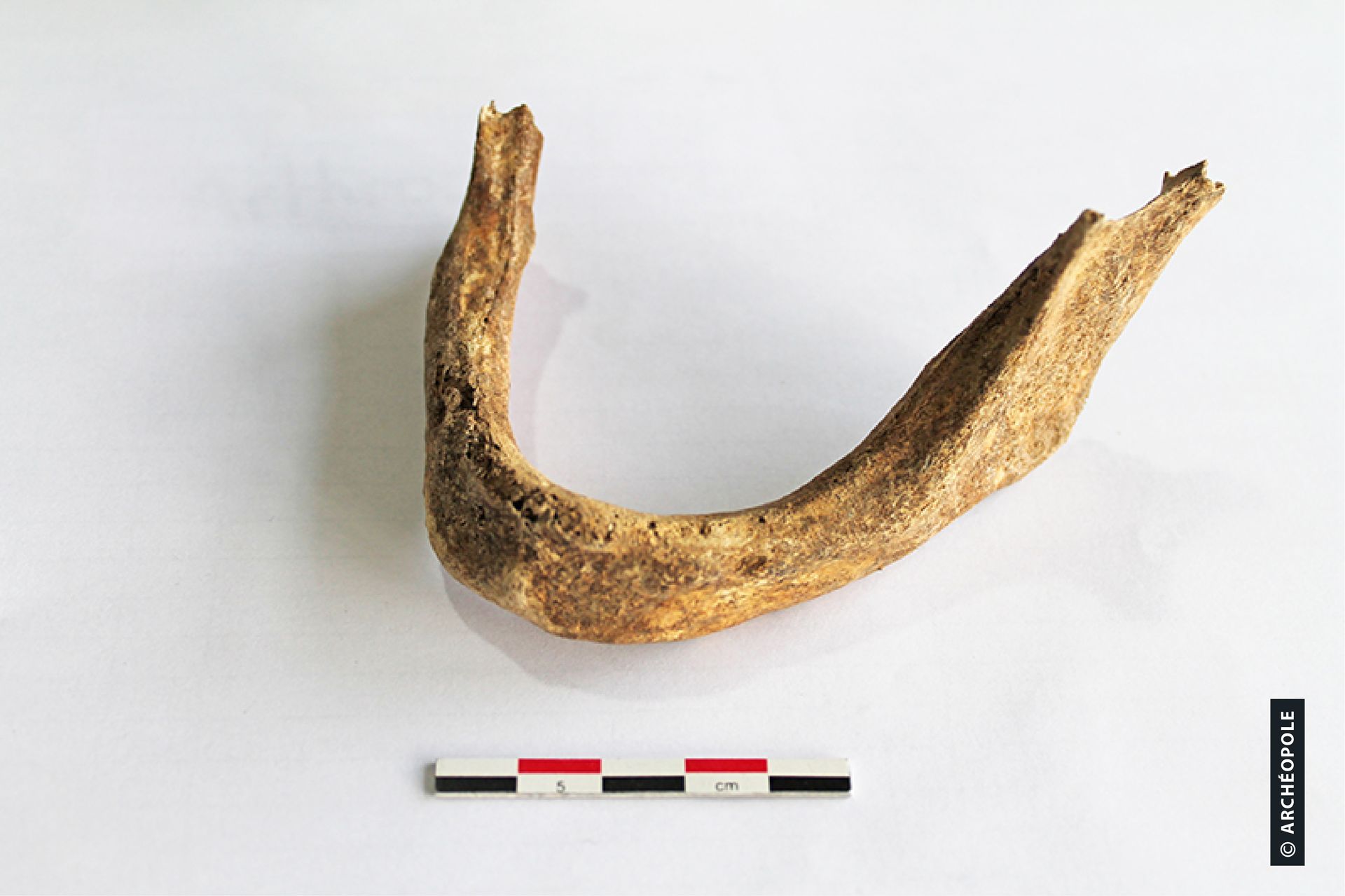 Mandibule dont les alvéoles dentaires sont résorbées (pathologie liée au vieillissement). © Photographie A. Desrue, Archéopole 2017