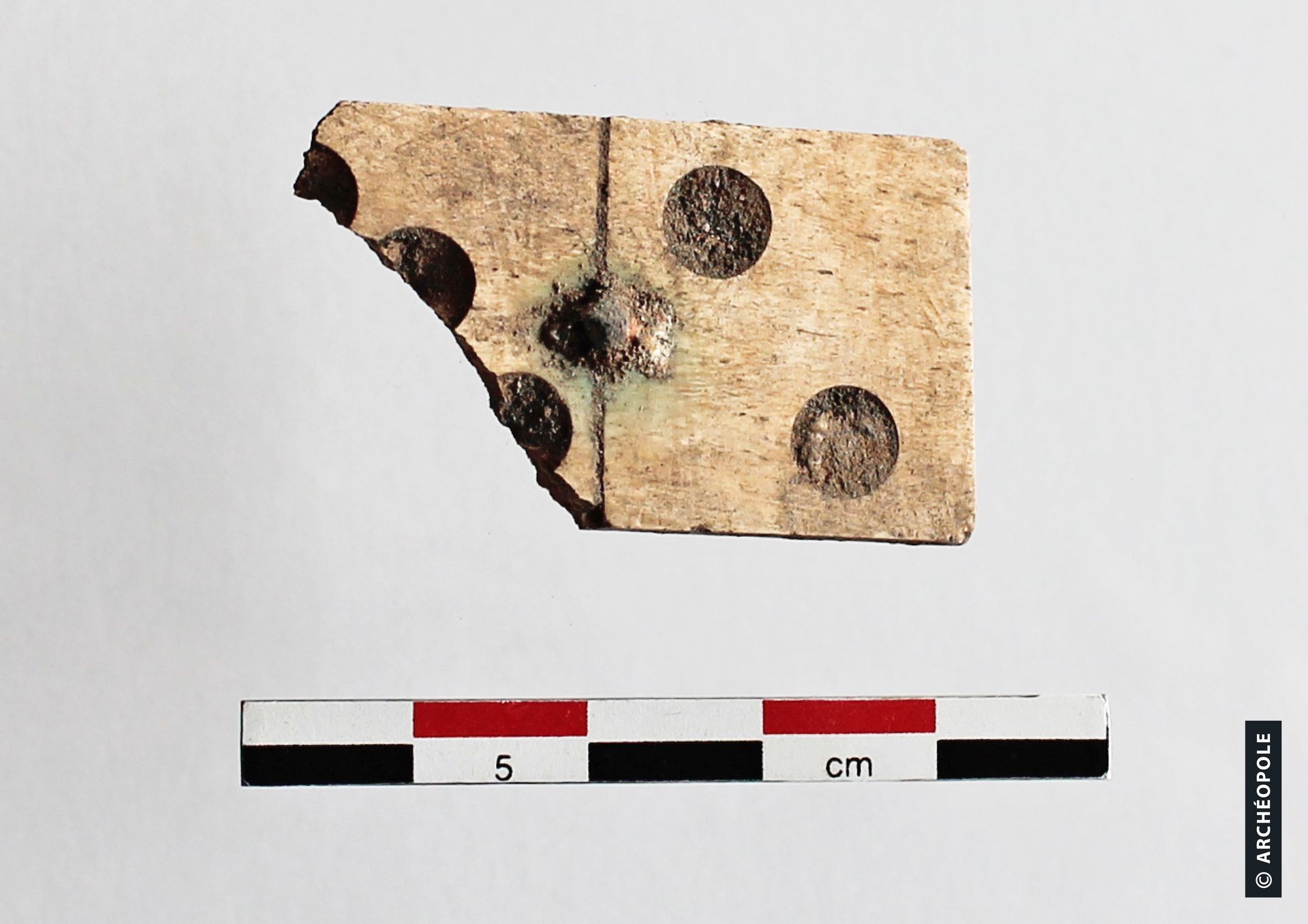 Domino fragmenté composé d'une plaquette en os et d'un rivet en métal. © Photographie S. Fiévet Archéopole 2017