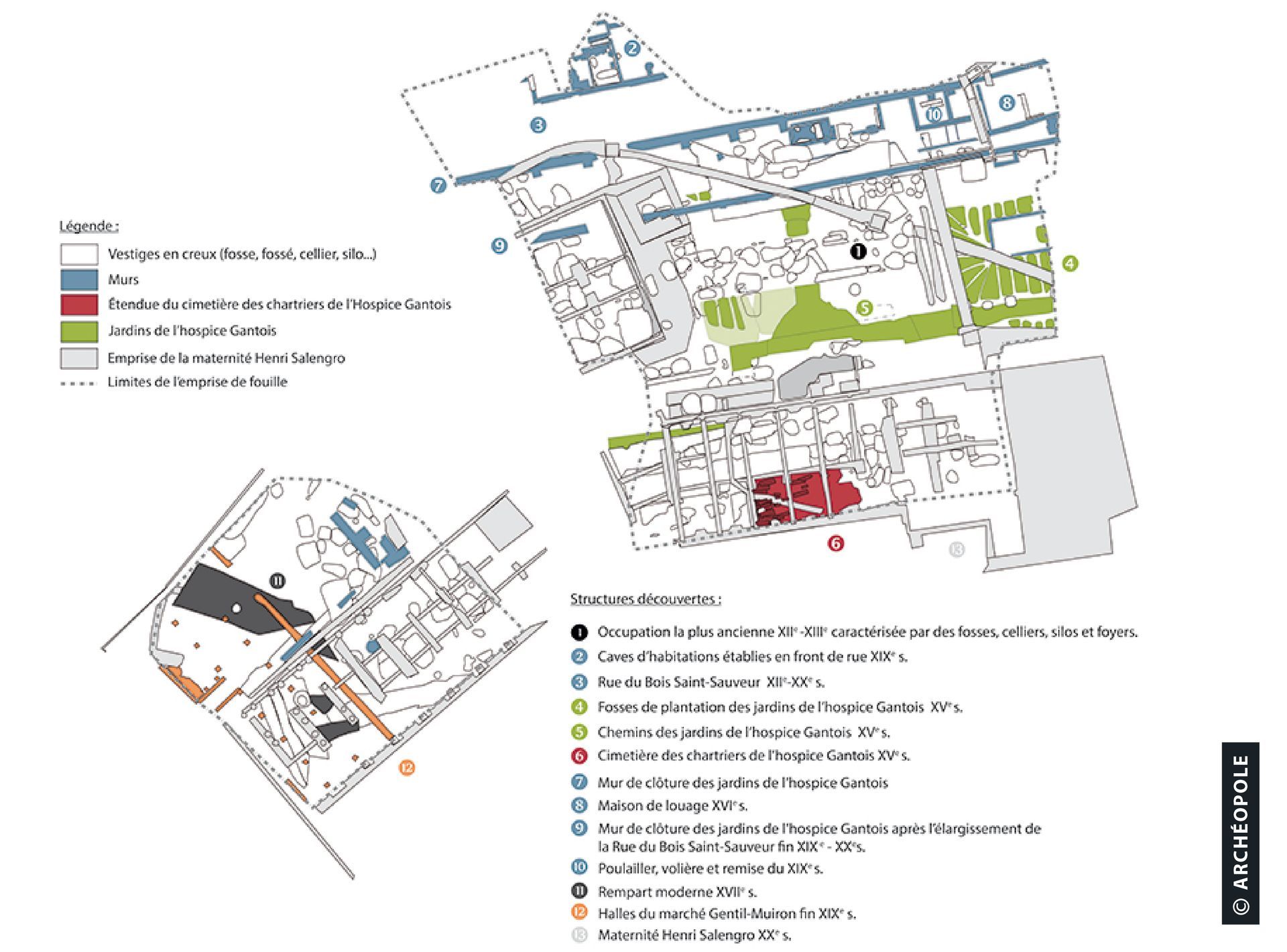 En l'état actuel d'avancement de la post-fouille, un « bruit de fond » attribuable à la période antique est décelable à travers plusieurs fossés, quelques fosses et trous de poteaux et une cuvette colmatée ayant fourni du mobilier céramique. Le premier état d'occupation intervient seulement à la fin du XIIe siècle ou au début du XIIIe siècle avec l'intégration, attestée dans les sources écrites, du secteur à la paroisse Saint-Sauveur et se poursuit jusqu'à la fondation de l'hospice Gantois au XVe siècle. Cette phase est renseignée par la formation d'une trame urbaine organisée avec l'implantation de plusieurs îlots. Celui nous concernant est encadré au nord par la rue Rue du Bois Saint-Sauveur présentant plusieurs niveaux de circulation et d'exhaussements successifs, des fossés à l'est et au sud et probablement le rempart médiéval à l'ouest révélé par la mise au jour de deux plots en calcaire et d'un fossé bordier. À l'intérieur, des structures d'habitat basées sur des poteaux et des sablières basses se dessinent en front de rue et de part et d'autre de l'axe de circulation mis en valeur, l'arrière des habitats semblant être dévolu aux jardins et activités diverses. De multiples fosses ont en effet fourni un mobilier important principalement céramique et faunique. Des niveaux de sol constitués d'argile jaune compacte et des niveaux d'abandon sous forme de lentilles charbonneuses sont de même conservés. La structuration est peut-être plus importante au sein des îlots avec des effets de contrainte perceptibles au niveau de l'implantation des fosses. Le secteur sud se distingue par l’organisation des vestiges et la nature des comblements et du mobilier recueilli qui laisse présager d'un artisanat particulier. En effet, un ensemble de fosses sub-quadrangulaires, au remplissage organique ayant livré quelques éléments en cuir (semelles, chutes...), s'organise le long du rempart médiéval et d'un fossé longeant la rue Malpart dont la première trace écrite remonte au XVe siècle mais dont l'existence est probablement antérieure.