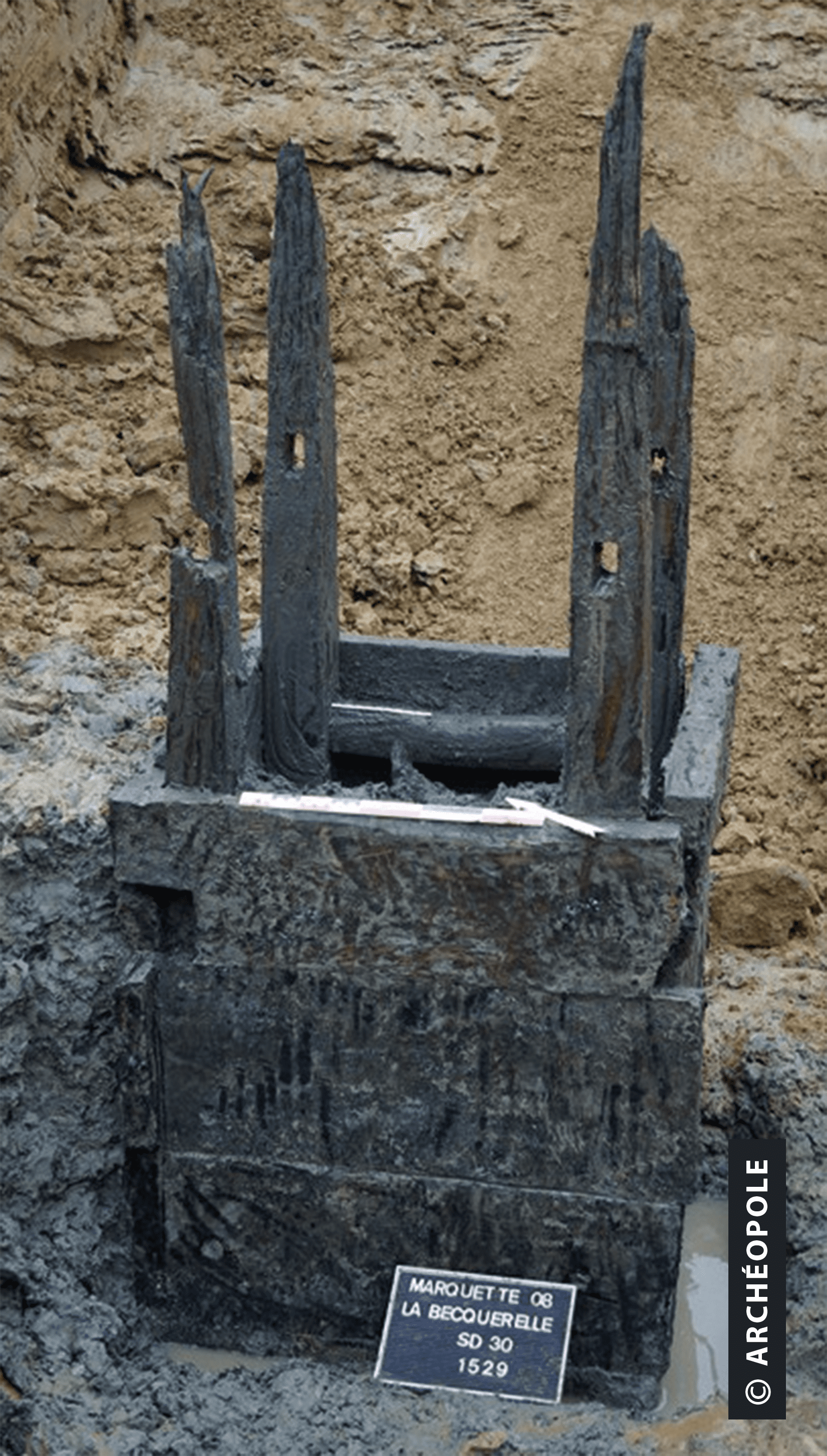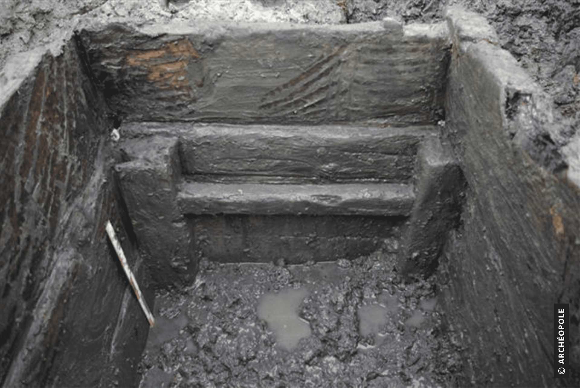 Puits à eau doté d'un cuvelage en bois. Les planches sont clouées sur une ossature interne formée de quatre montants angulaires solidarisés par un jeu de traverses embrevées en alternance. © Photographie L. Gubellini Archéopole 2009