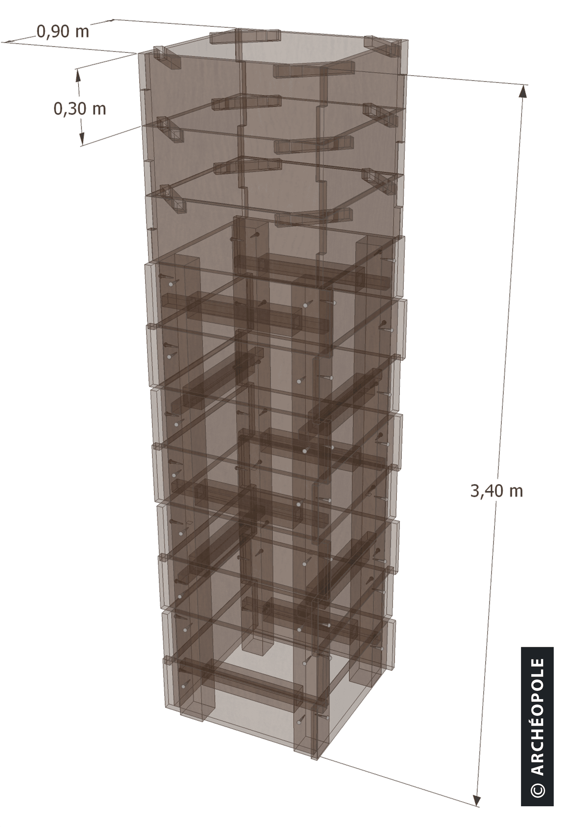 Modélisation du cuvelage d'un des puits à eau du site illustrant différents systèmes d'assemblage des planches. © B. Lagache Archéopole 2009