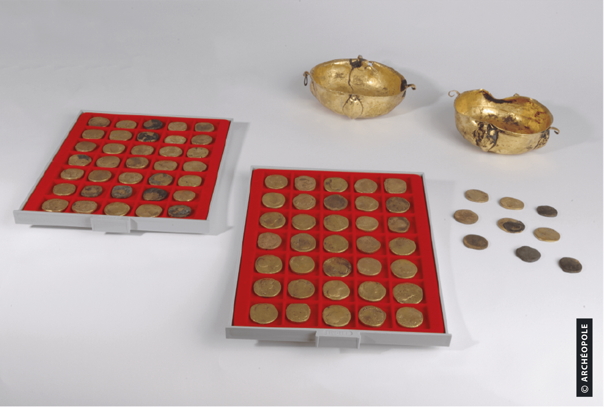 Plateaux d’une balance en base cuivre et trésor monétaire composé de 79 sesterces majoritairement frappés sous Antonin. © Photographie L. Gubellini Archéopole 2009