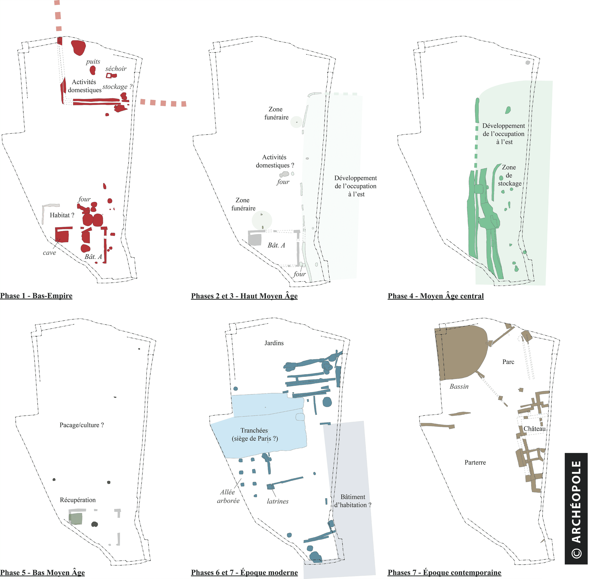 Plans synthétiques des différentes phases du site de Valenton. © DAO J. Schleifer, J. Delas, Archéopole