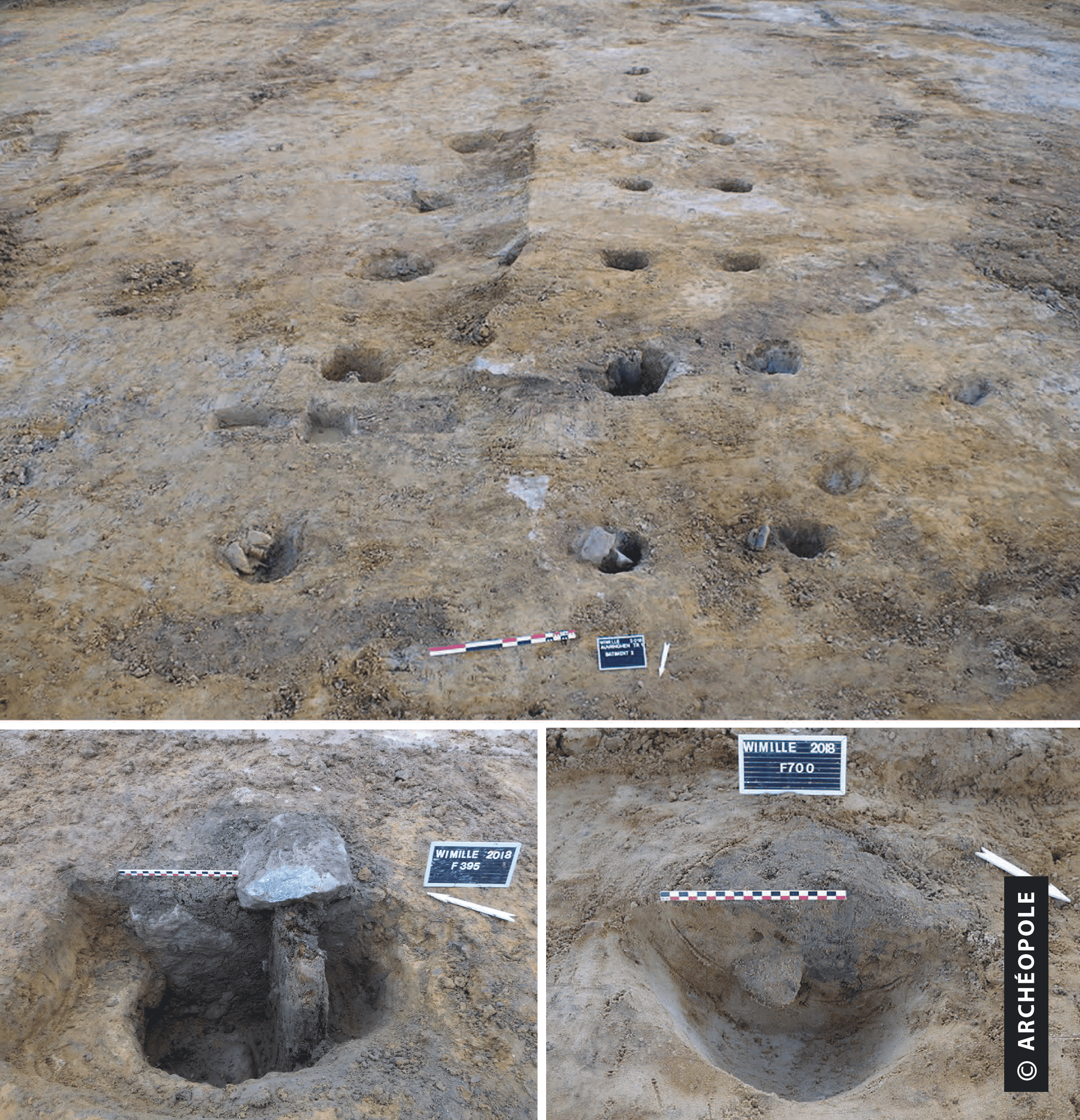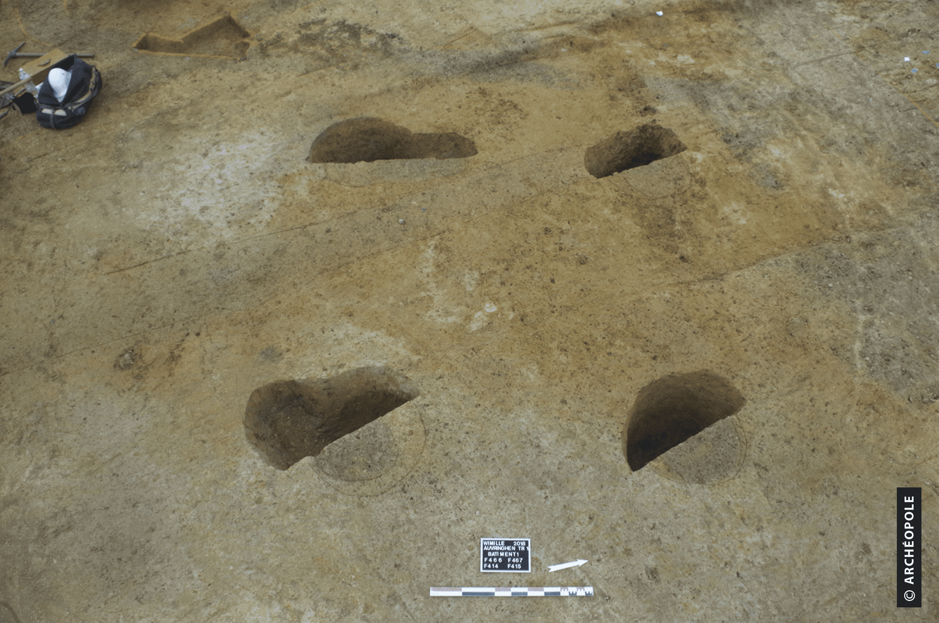 Vue des trous de poteaux du bâtiment 02 ayant livré des fragments de planches en bois de mélèze, épicéa et pin sylvestre. © Photographie Archéopole 2018