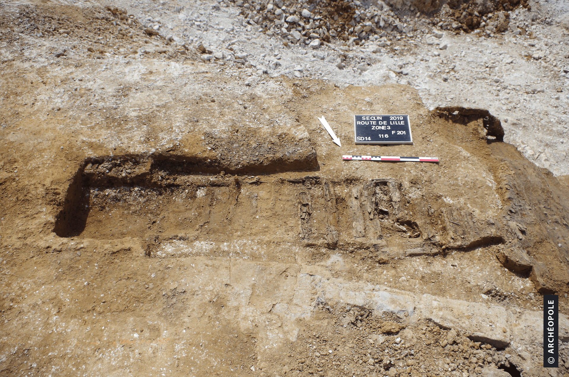 La troisième occupation se caractérise par l’installation d’un système militaire défensif allemand durant la Première Guerre mondiale, reliant les forts de Noyelles-les-Seclin et Seclin. Localisé dans les secteurs 2 et 3, il s’organise en deux lignes de défense, espacées de 33 m l’une de l’autre. Située au nord, la première ligne offre un plan à tranchées à traverses en U et à traverses tournantes, greffées de deux abris en arrière-ligne et d’un avant-poste (poste de surveillance). La seconde ligne, positionnée au sud, s’agence en un boyau sinueux irrégulier, donnant accès à deux abris en arrière de ligne. De nombreux aménagements ont été trouvés au sein des structures des deux lignes. Les tranchées peuvent comporter des banquettes de tir permettant aux soldats de se positionner lors des affrontements, des rigoles d’évacuation d’eaux usées parfois planchéiées et des escaliers facilitant leur accès. Les abris sont généralement rattachés aux tranchées par un boyau de communication, excepté l’avant-poste qui se démarque par une double entrée reliée à deux tranchées. D’une superficie comprise entre 20,40 m2 et 66,37 m2, ils sont agrémentés d’escaliers planchéiés et cloutés, pouvant être desservis par un caillebotis qui permettent leur accès, de puisards situés à l’entrée des abris pour recueillir les eaux usées, de trous de poteau, de mur de refend ou encore de sablières basses pour l’installation de planchers en bois ou de murs. Le mobilier (céramique, métal, faune) illustre les conditions de vie quotidiennne dans les tranchées par la nourriture (boîte de conserve), la consommation opportuniste de lapin et la vaisselle (porcelaine). Il documente aussi l’architecture des tranchées et des abris au travers des assemblages de pièces (boulons, agrafes, charnières), des outils employés (pelles), de la construction des rigoles (fragments de canalisation) et sur l’armement employé (grenade fumigène de 1917) et les moyens défensifs usités (fils de fer). Du point de vue historique, ce système défensif est opérationnel entre le 22 octobre 1916 et le 11 octobre 1917. Les origines de ce système allemand restent sans réponse mais elles ne peuvent être antérieures au mois d’août 1914 avec l’arrivée des allemands sur la place forte de Lille.