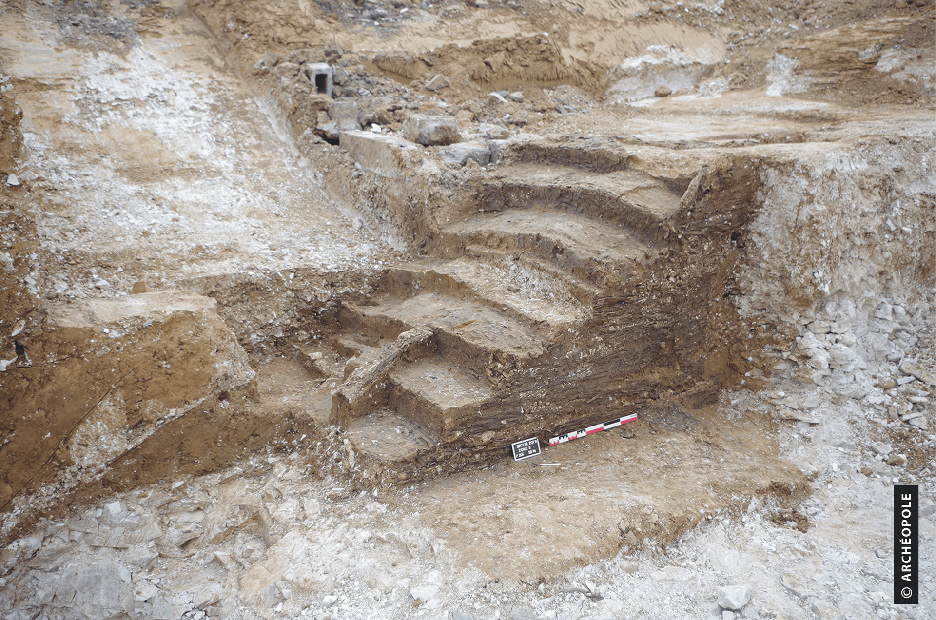 Escalier planchéié et clouté permettant l'accès à un abri de la Première Guerre mondiale. © Photographie Archéopole